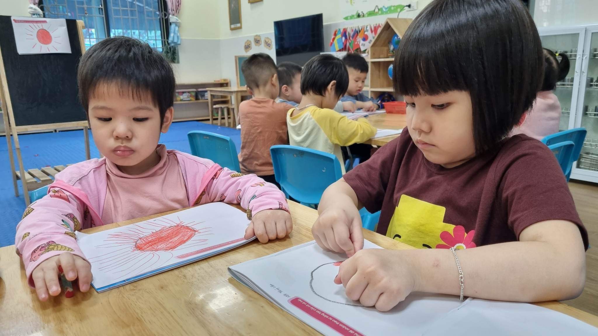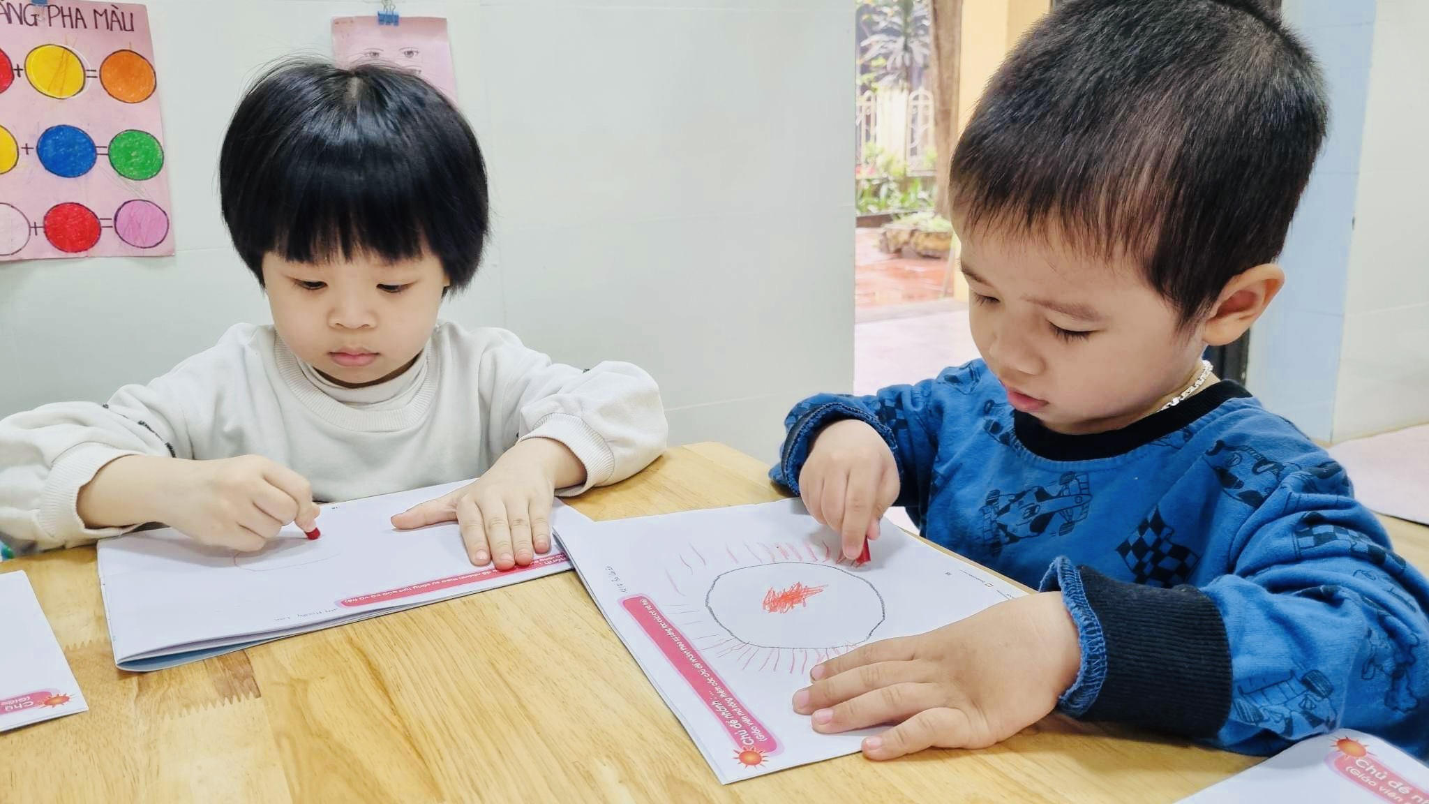 Các bạn nhỏ rất chăm chú vẽ bức tranh ông mặt trời.